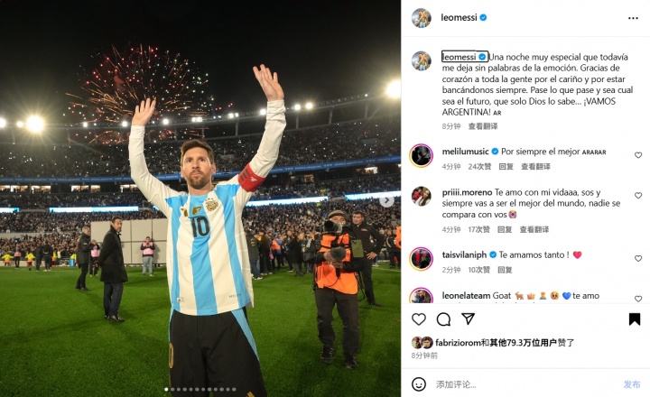 梅西在社媒发文写道:“一个非常特别的夜晚,激动得让我至今无言以对。衷心感谢所有人的爱和一直以来的支持。不管发生什么,不管未来如何,只有上帝知道……阿根廷加油!”