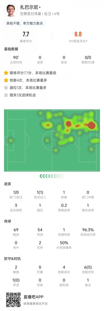 扎巴尔尼数据:7次对抗5次成功+4次抢断2次解围,7.7分全场最高
